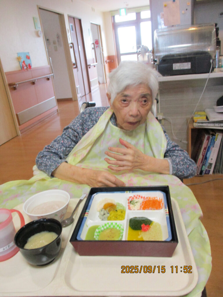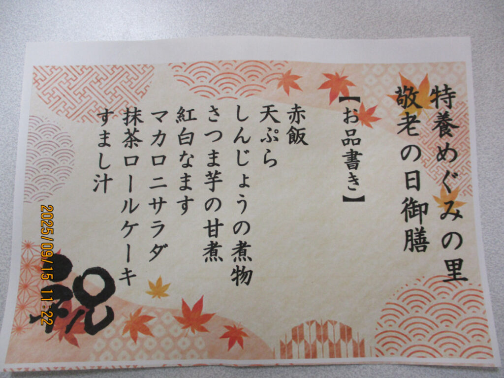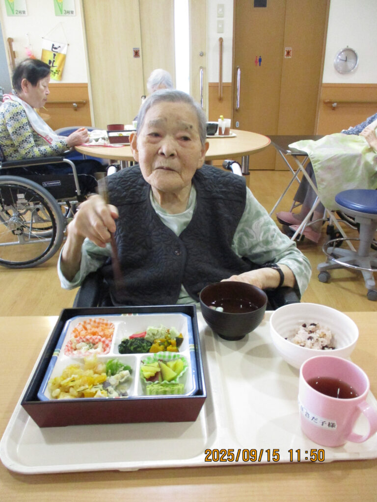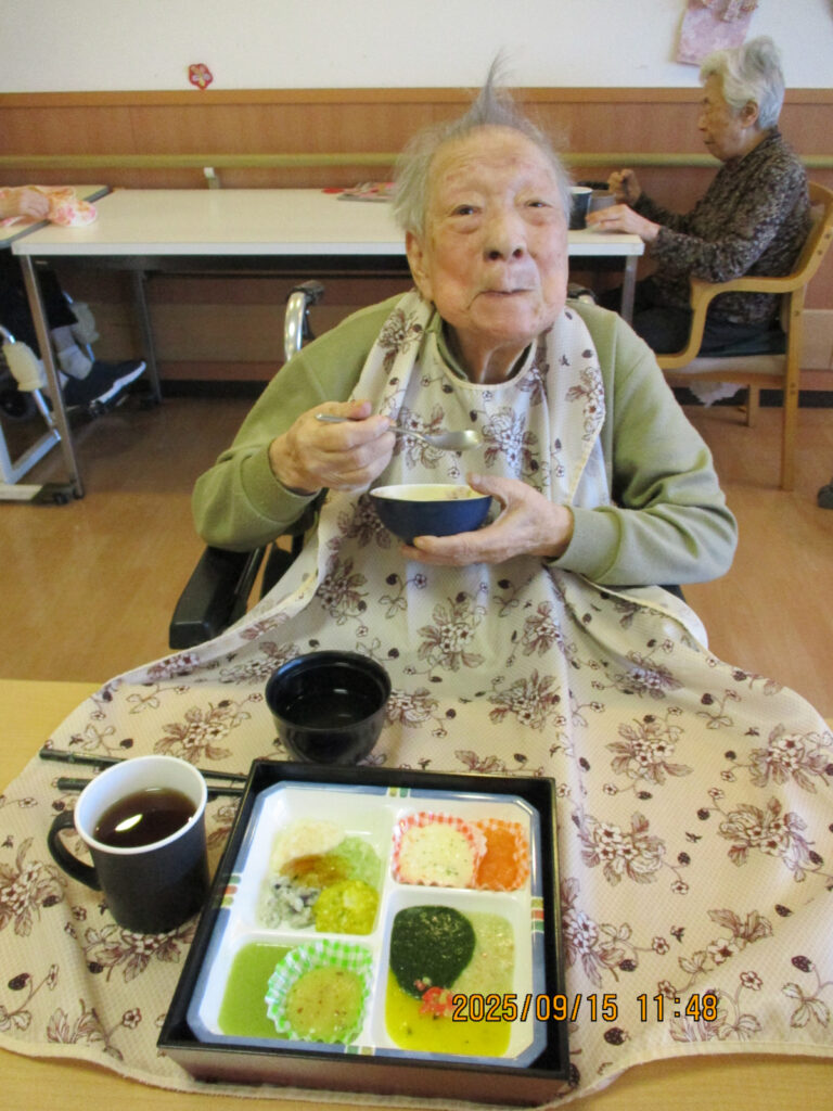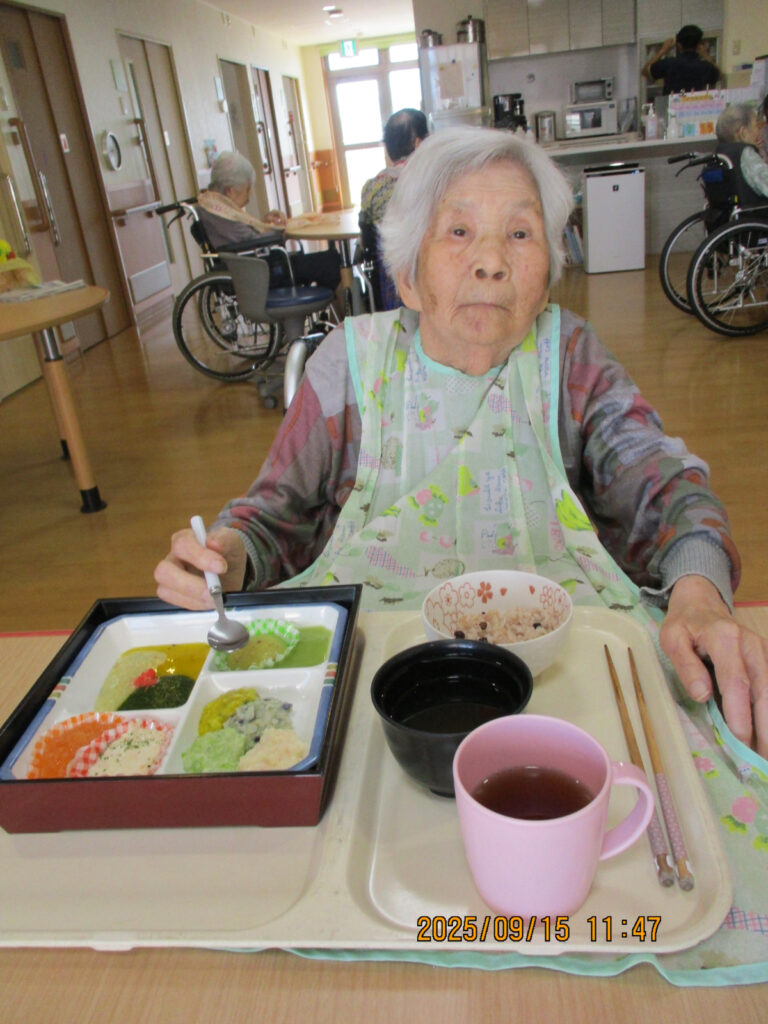 本日の敬老の日特別メニューは、めぐみの里のご利用者様の健康と長寿を願い、厨房スタッフが心を込めてお作りした「ご長寿の昼御膳」を提供いたしました。
