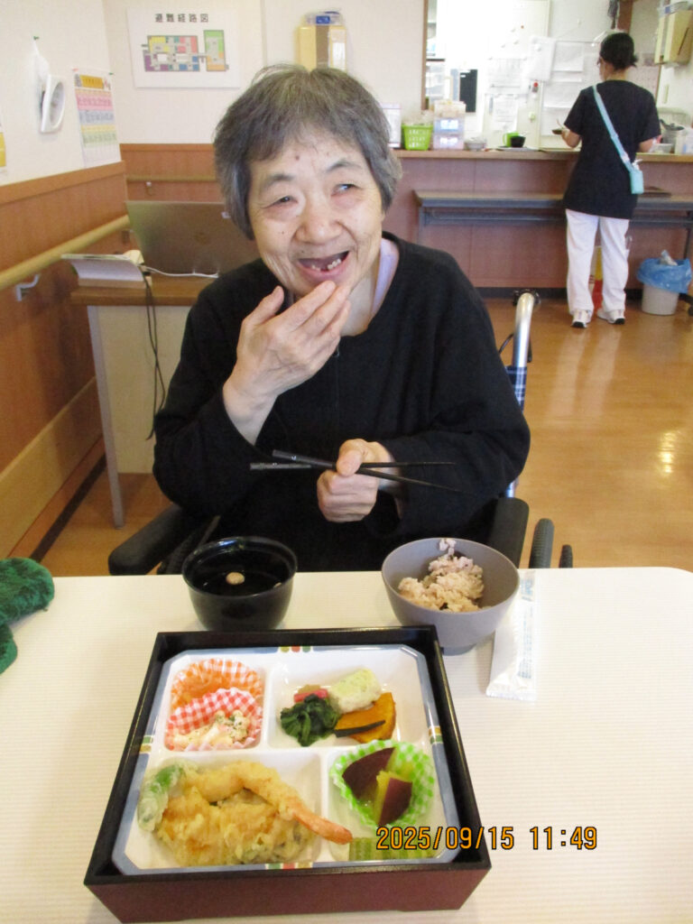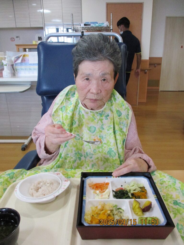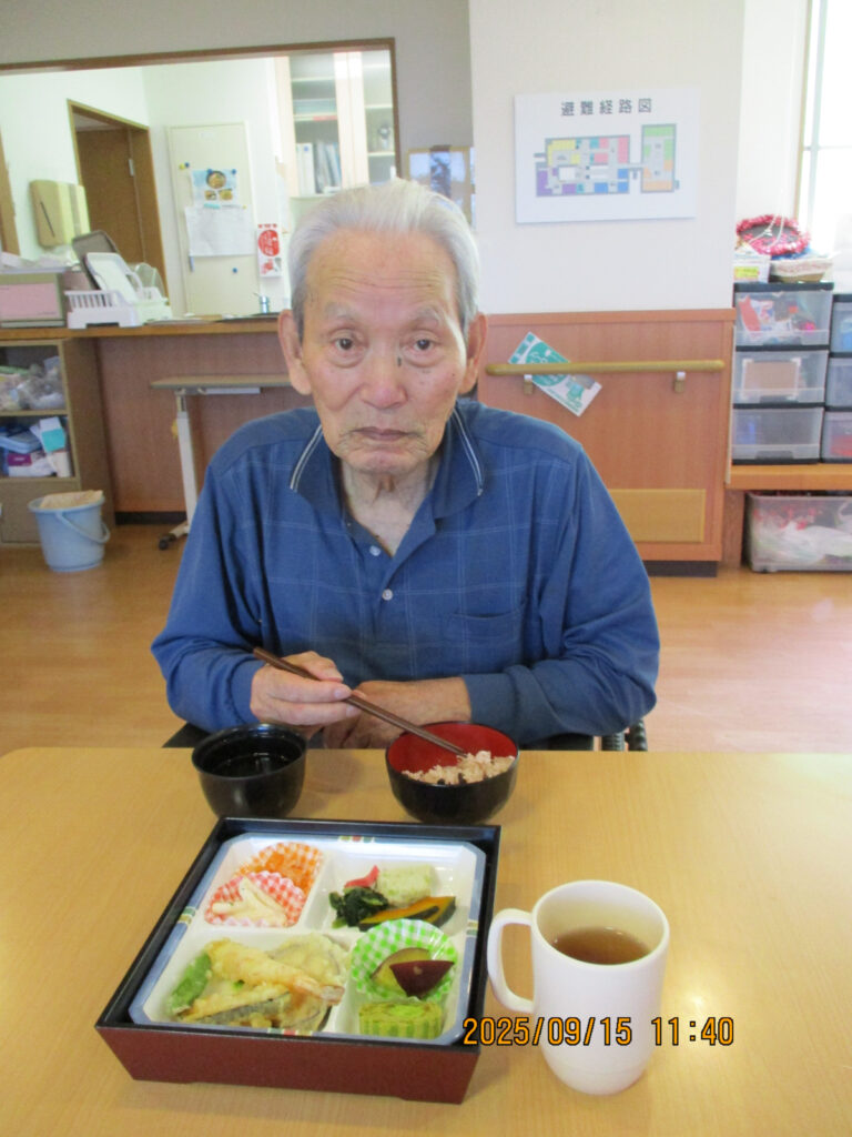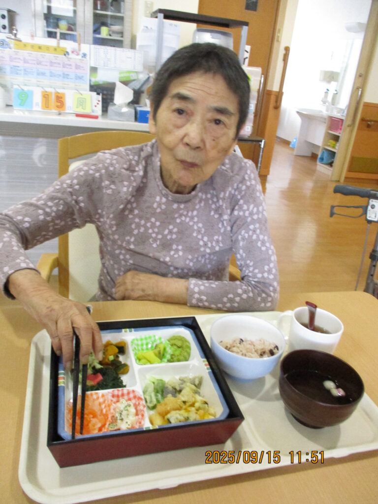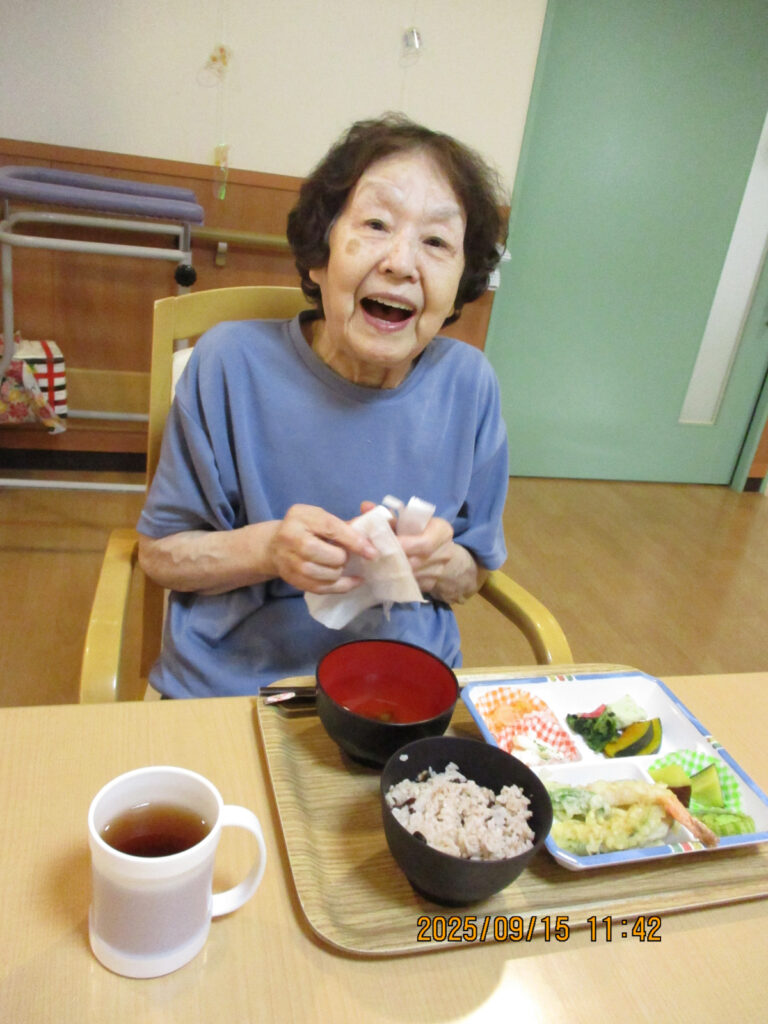 本日の敬老の日特別メニューは、めぐみの里のご利用者様の健康と長寿を願い、厨房スタッフが心を込めてお作りした「ご長寿の昼御膳」を提供いたしました。