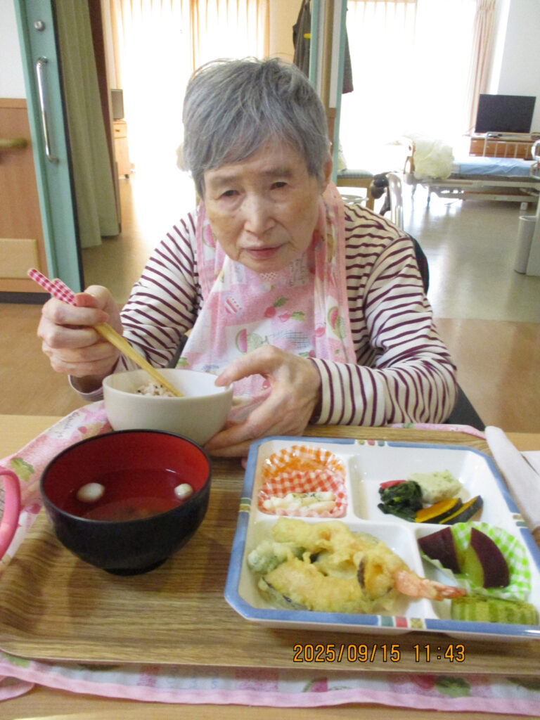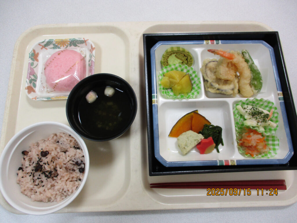 お料理は、『赤飯、天ぷら、しんじょうの煮物、サツマイモの甘煮、紅白なます、マカロニサラダ、すまし汁、そして抹茶のロールケーキ』と、敬老の日の祝い膳とさせていただきました。