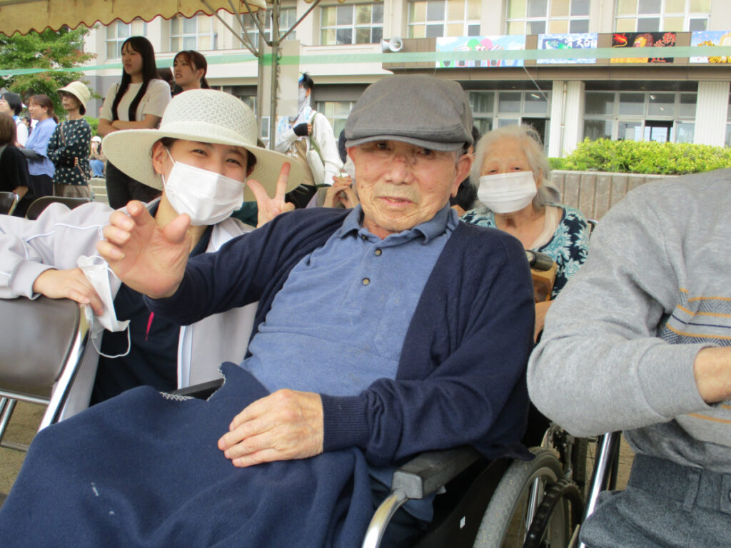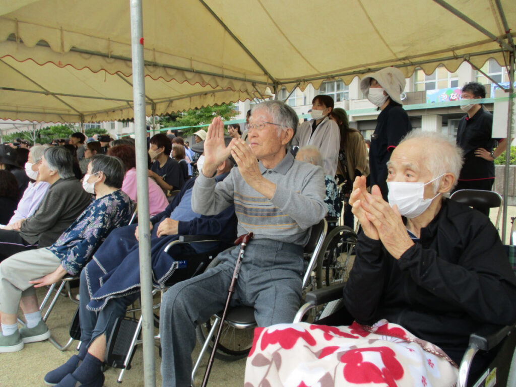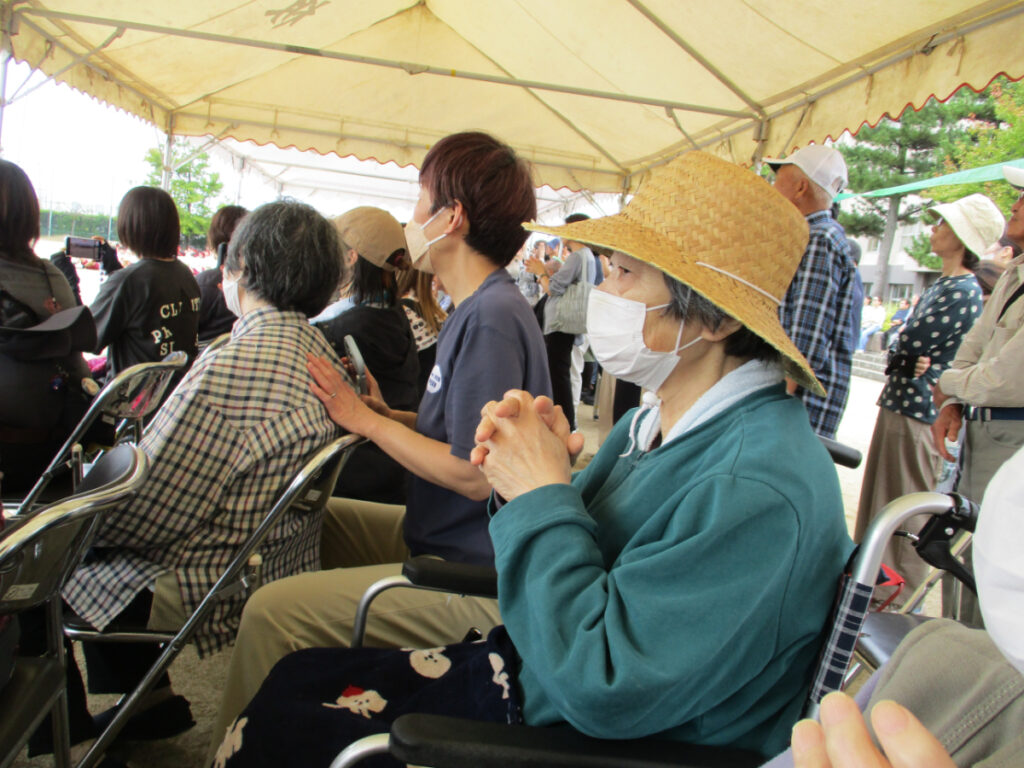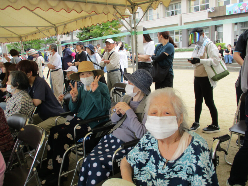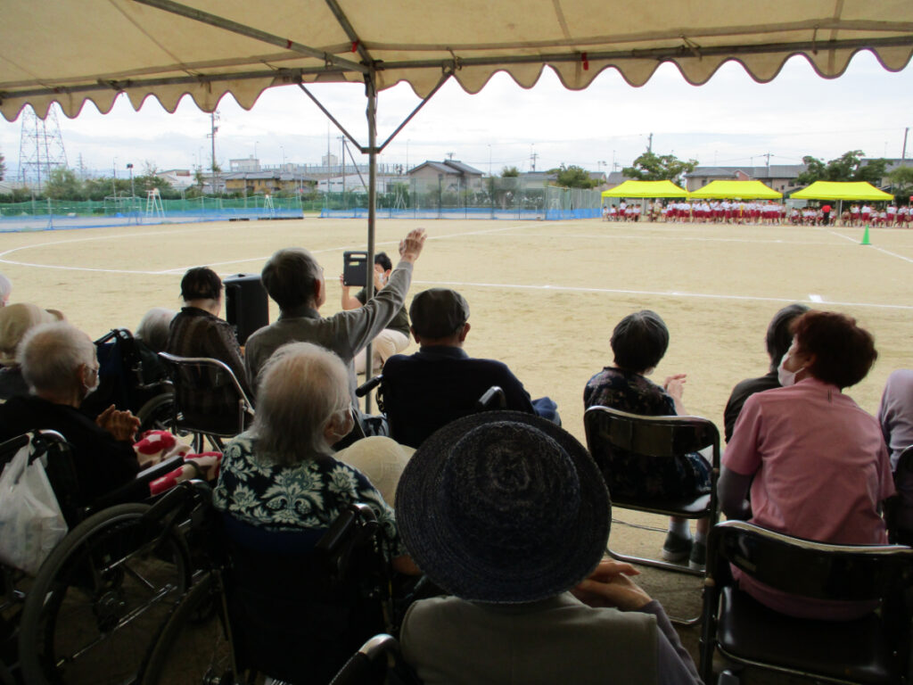 お隣には犬丸子ども園の園児たちも参加しており、元気いっぱいの声に、当施設のご利用者の皆様もつられて一緒に応援を楽しんでおられました。騎馬戦やリレーなど迫力ある競技が続き、「楽しかった」と多くの方が笑顔で感想を話されていました。