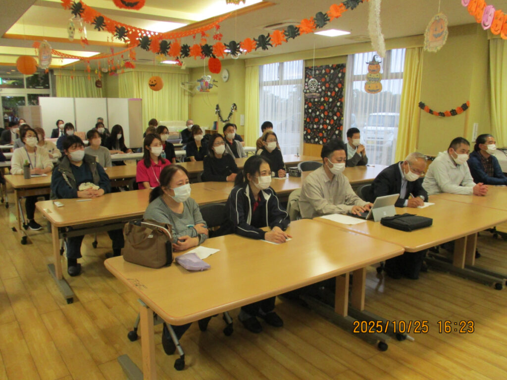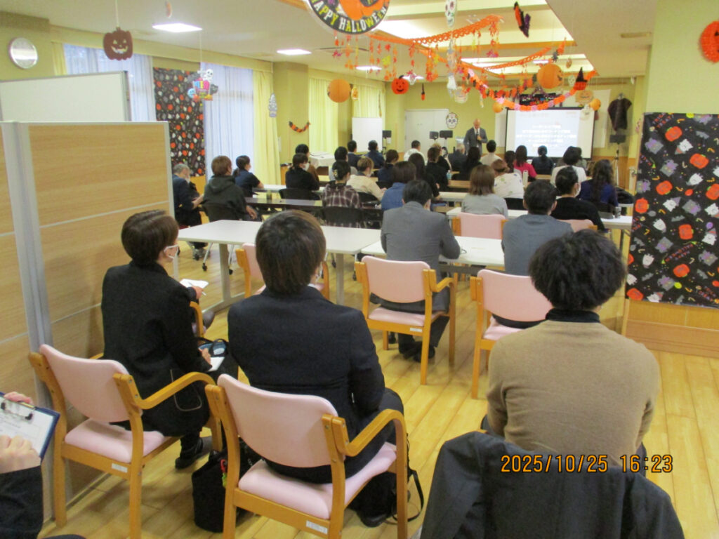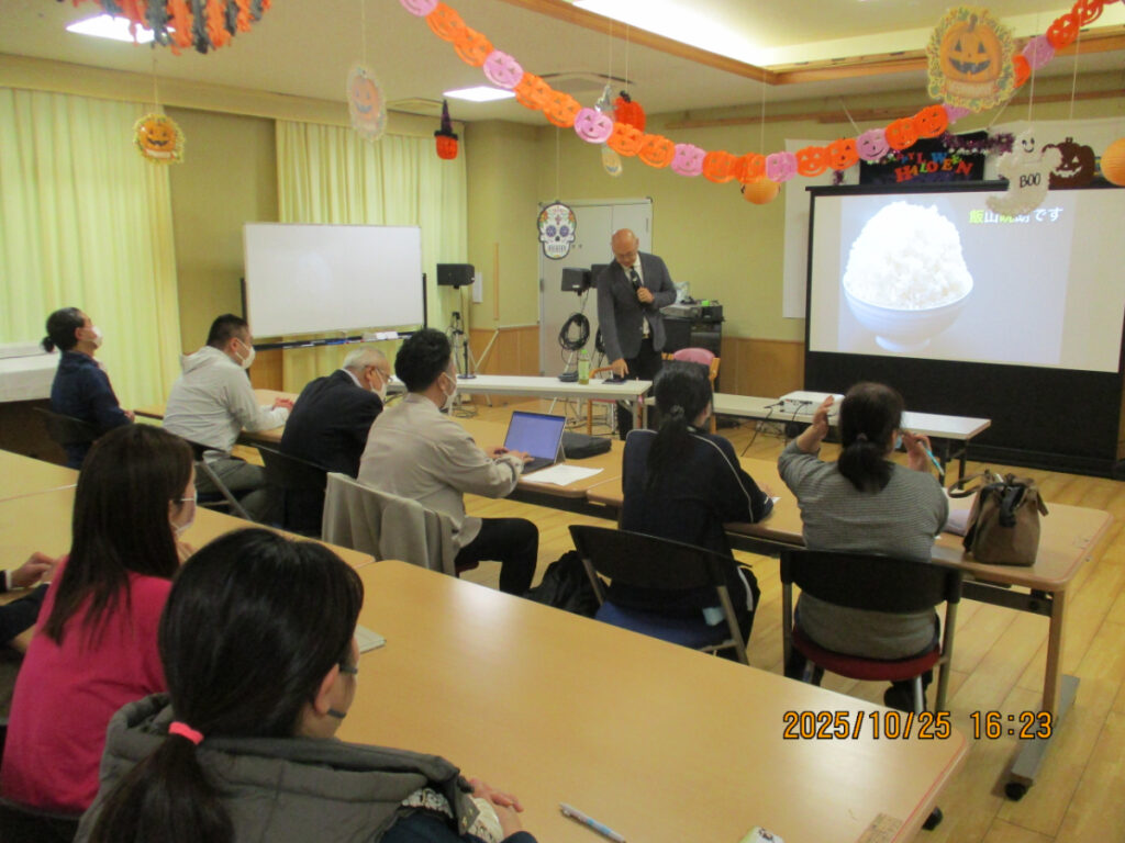 令和7年10月25日(土) 16時15分 ~ 17時40分 人財教育家・メンタルコーチ 飯山 晄朗(いいやま じろう)先生をお招きし、「人生を豊かにするメンタルマネジメント」と題し、職員向けのモチベーションアップ研修を行いました。 めぐみの里、みゆきの郷、千葉県の天宣会グループ施設の職員が集まり全40名が受講しました。