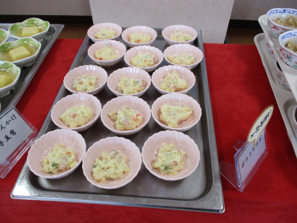 料理は、品数を多く召し上がっていただけるよう一品ごとに小さめの盛り付けとし、ご利用者の皆様には4~5品を選んでテーブルまで運んでいただく形としました。